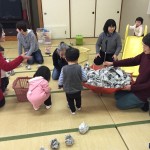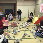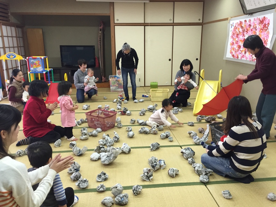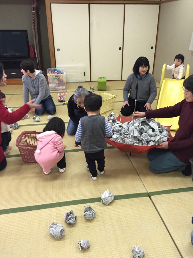 新聞紙を丸めた雪にビックリし、子どもたちの元気な姿と赤ちゃんの