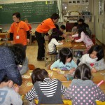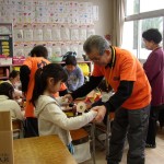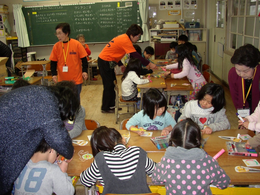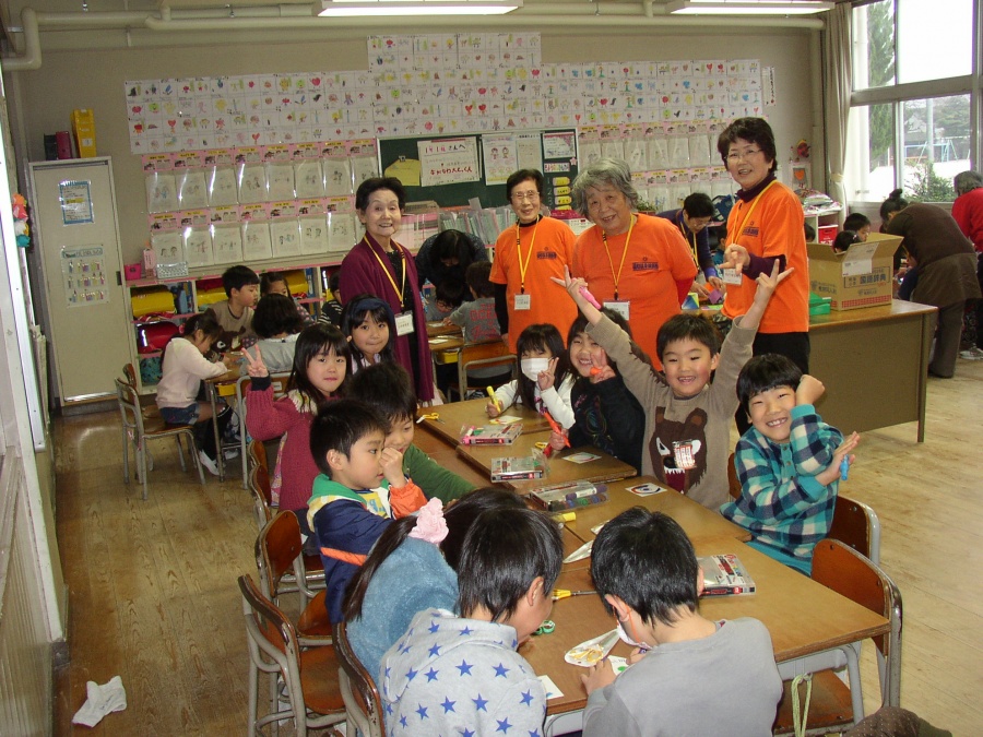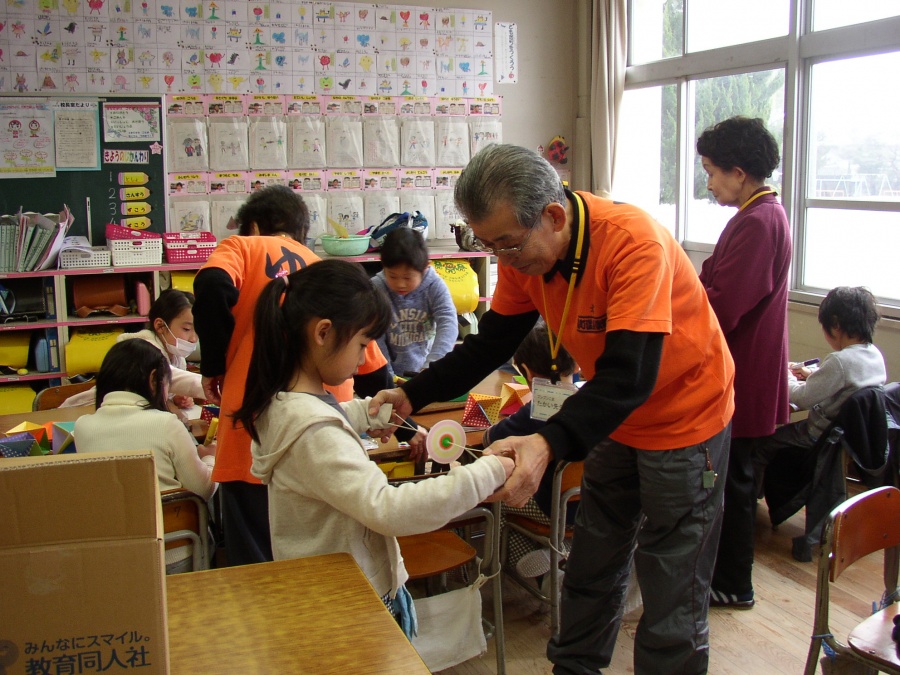湯町温泉クラブ老人会の皆さんが、二日市小学校を訪問し、一年生の授業の一環として「昔遊び」の先生になりました。