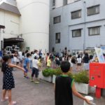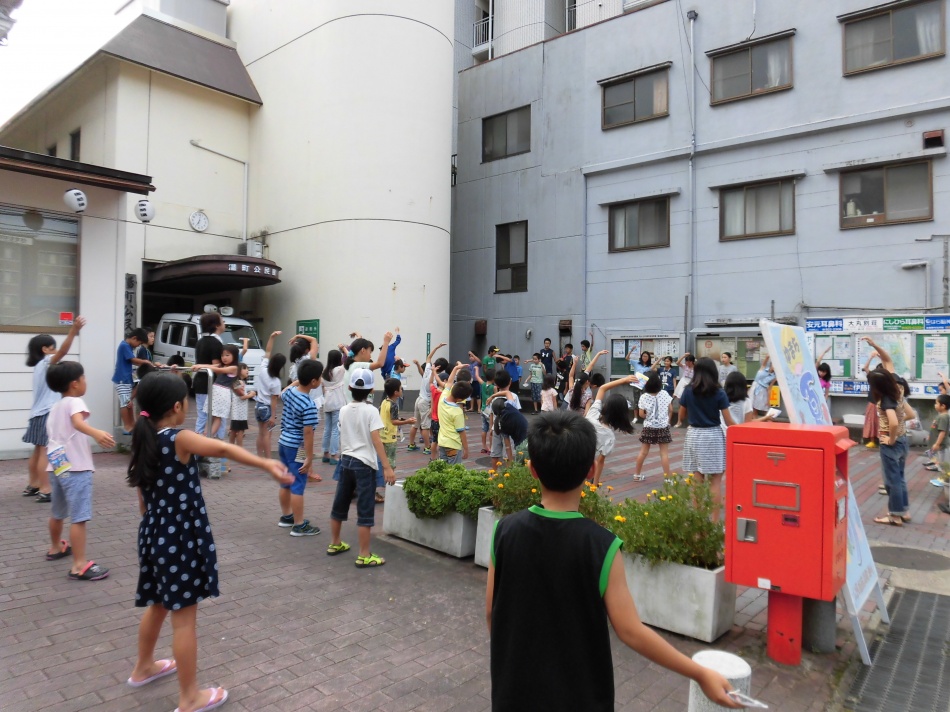 湯町公民館前と天拝通り公園で眠い目をこすりながら、ラジオ体操を頑張りました。