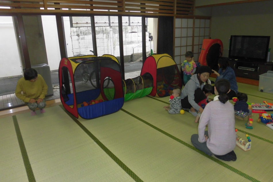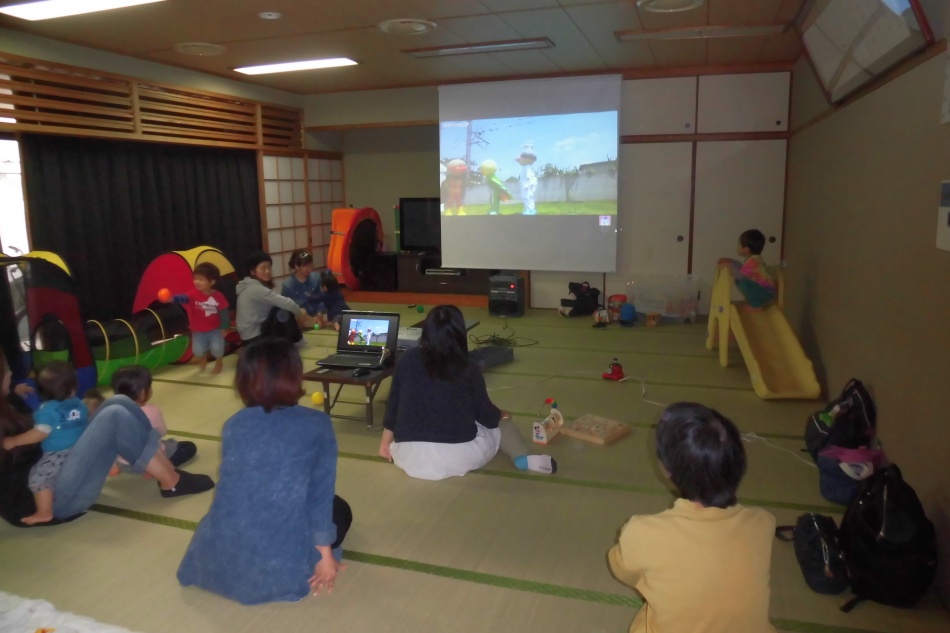天拝公園に行く予定でしたが、雨天の為公民館和室でアンパンマンを見て仲良く遊びました。