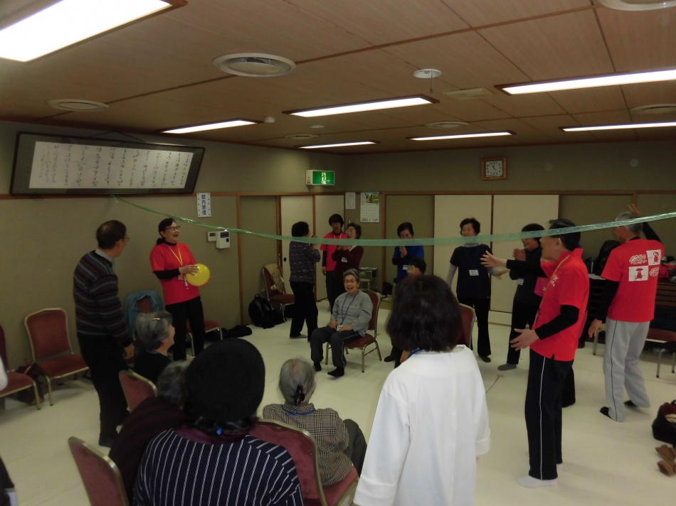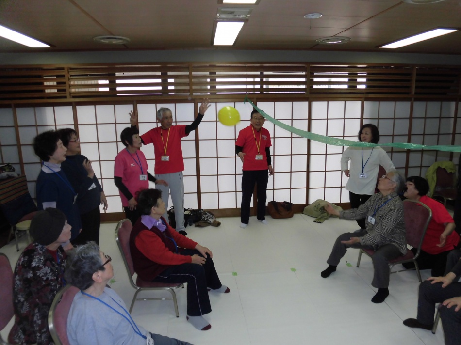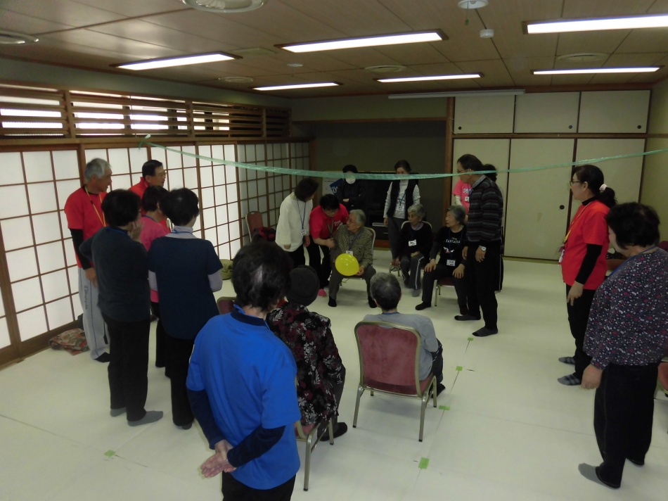 健康運動指導士さんが楽しく指導されます。原則65才以上の方は、どなたでもお気軽に参加されています。椅子を使ったストレッチや風船バレーなどを行っています。