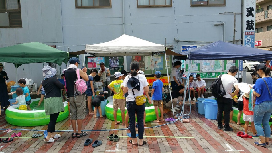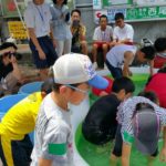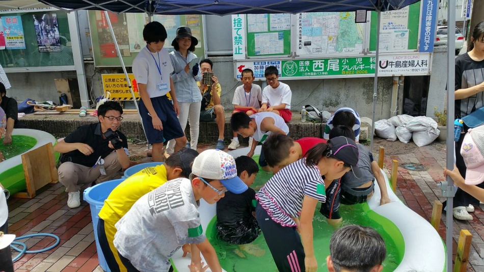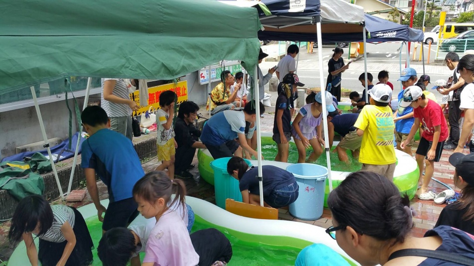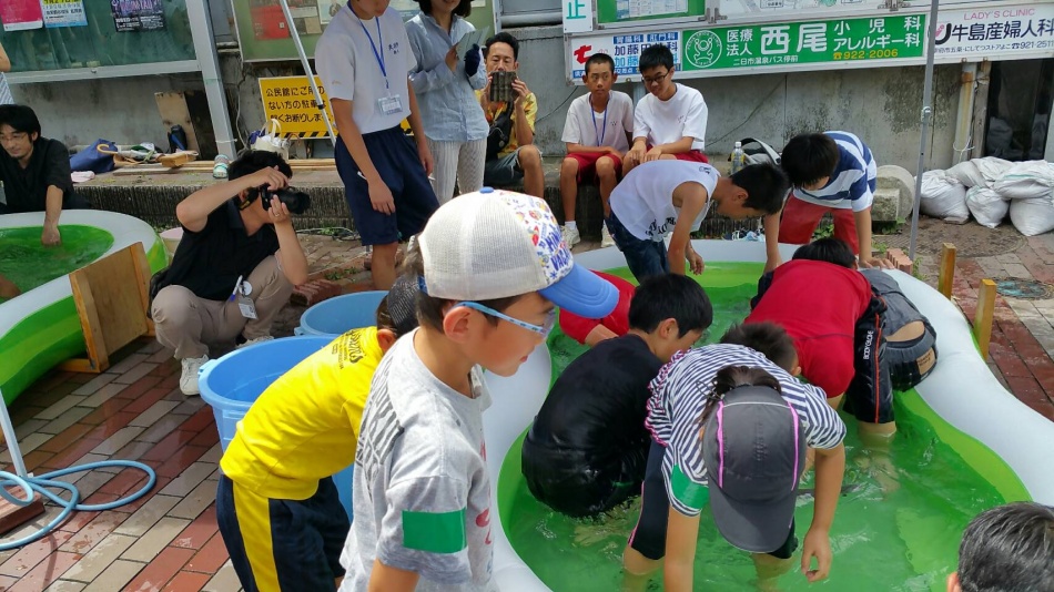 うなぎ・やまめ・こい・どじょうを歓声をあげて、掴みました。天拝中学校の学生も地域貢献活動として手伝ってくれました。