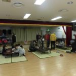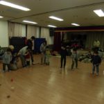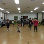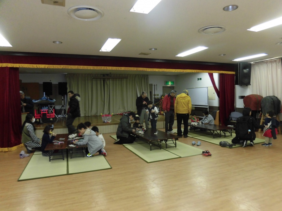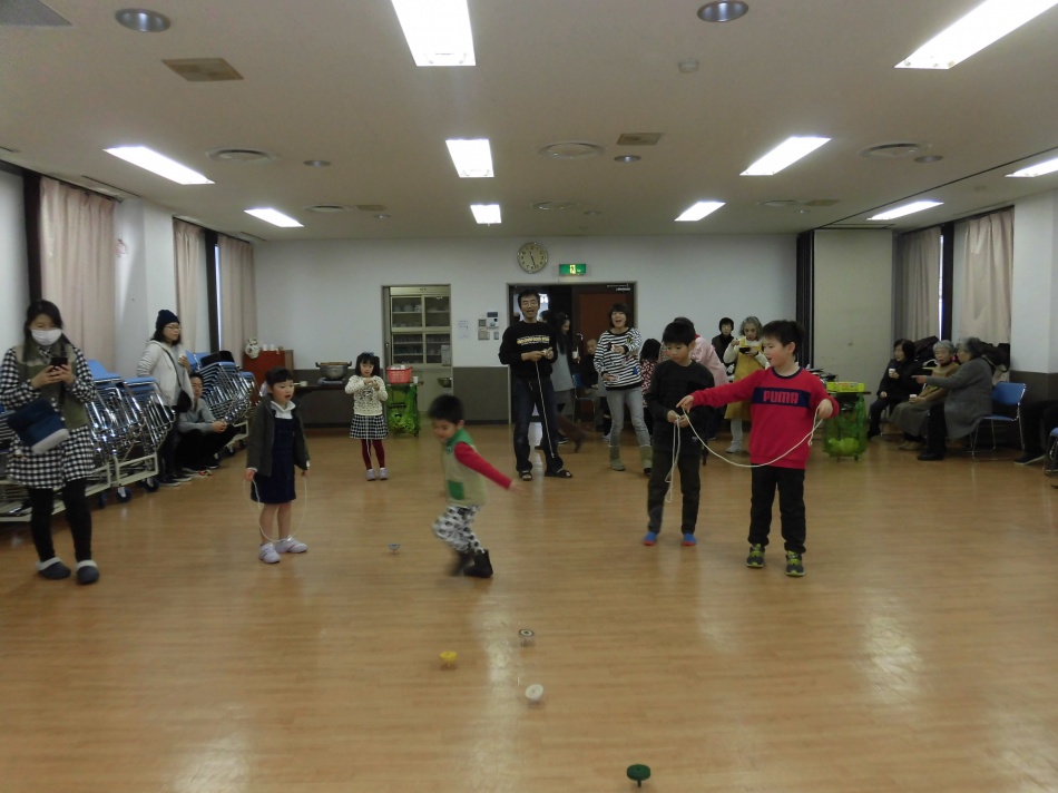 白木のこまに色をつけ、初めての子どもたちも教えて頂いて、上手に回せるようになりました。ぜんざいや、きな粉餅も食べました。