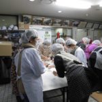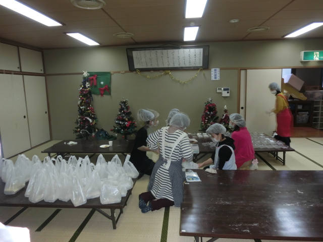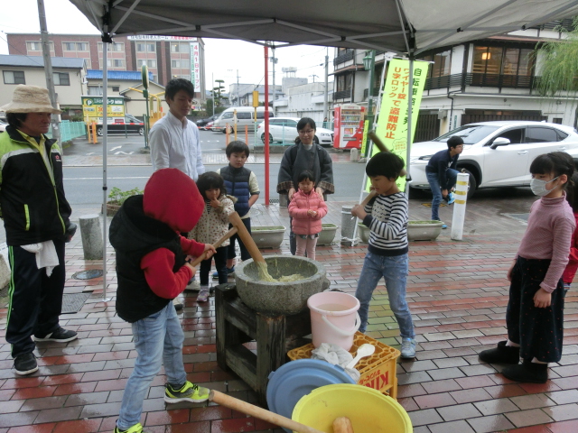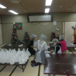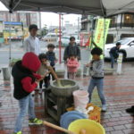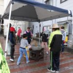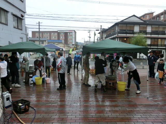 あいにく少し雨模様でしたが、たくさんの人が集まり毎年恒例の餅つきをしました。民生委員、福祉委員、中学生、子供たちで独居老人の方にお餅を配りました。