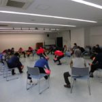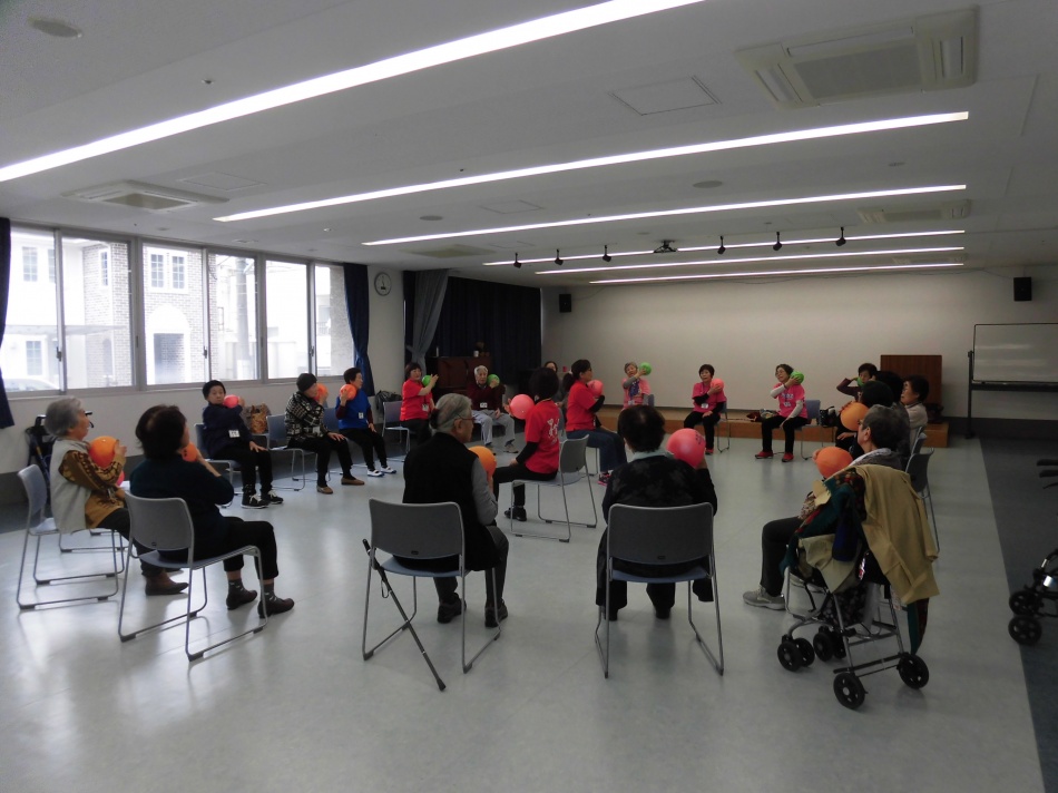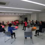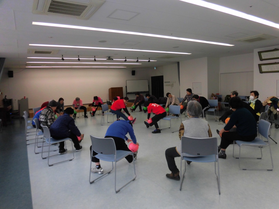 健康運動指導士さんが楽しく指導されます。原則65才以上の方は、どなたでもお気軽にご参加ください。写真はボールを使ってストレッチ💛