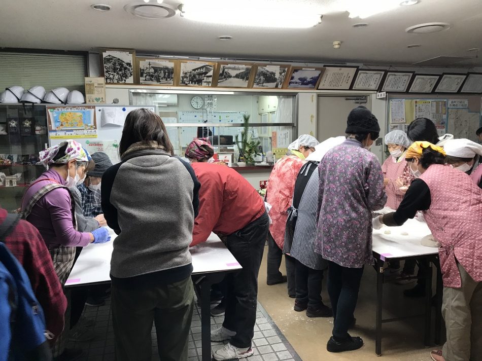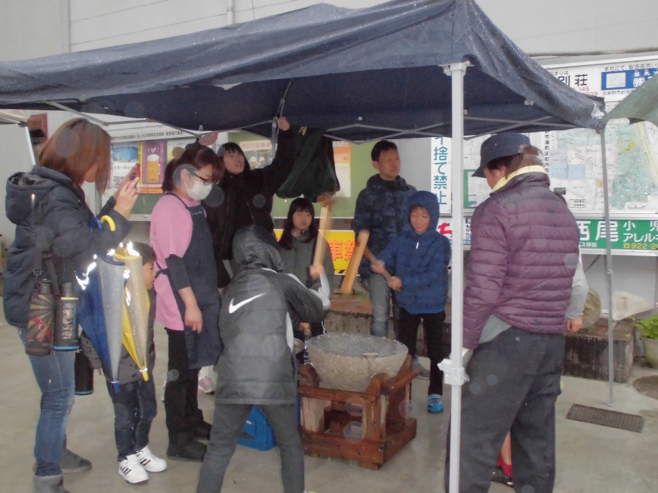 12/22あいにく雨模様でしたが、たくさんの人が集まり恒例の餅つきをしました。民生委員、福祉委員、子どもたちで一人暮らしの高齢の方にお餅を配りました。