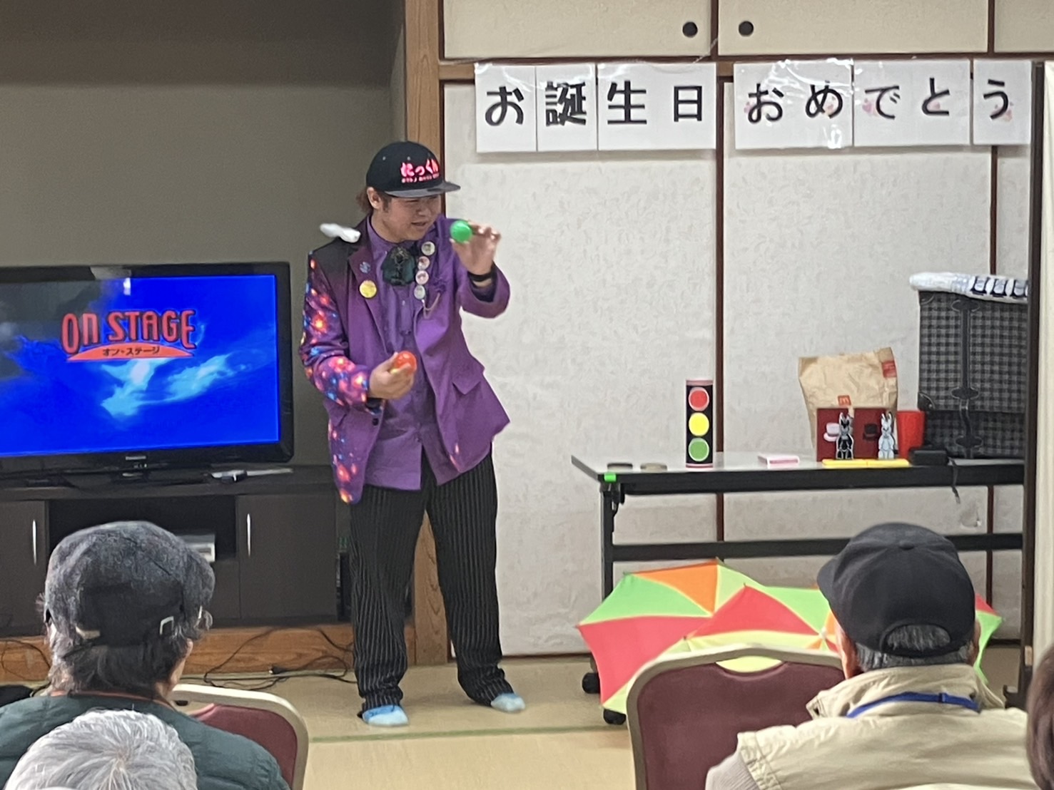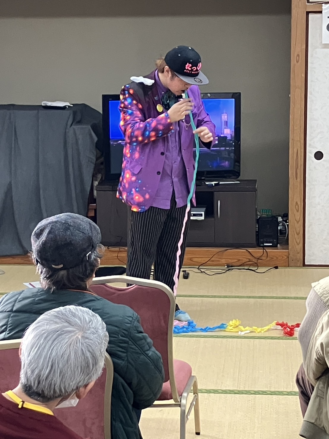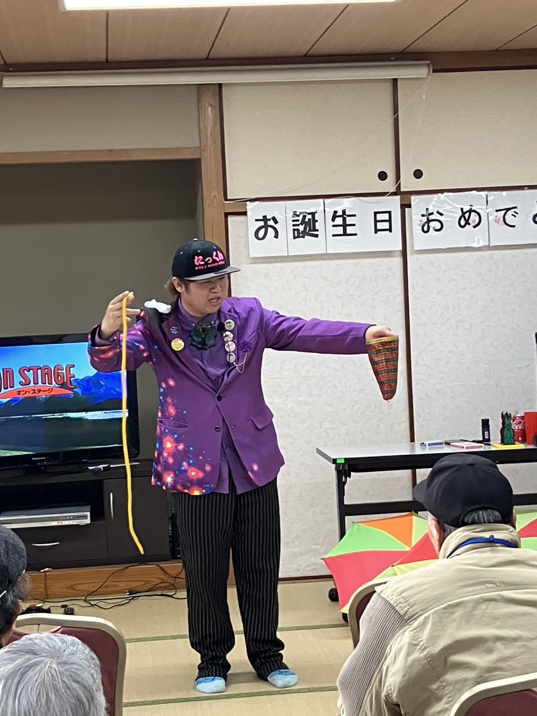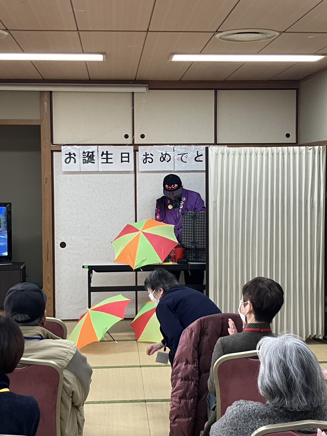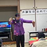 2月17日」令和6年度後期誕生会を行いました。該当者14名に大串会長からバラの花を手渡されました。『たっくんのマジックショー』で大いに盛り上がり、カラオケ・コーラス・会食で楽し時間を過ごしました。