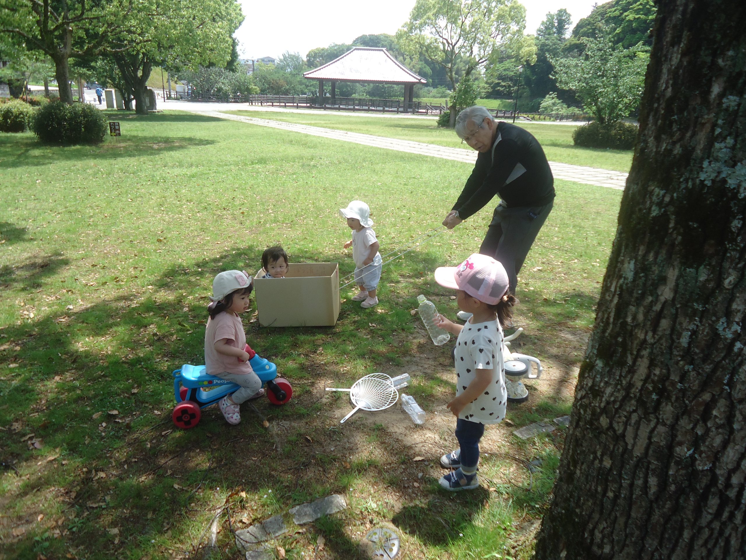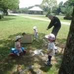 5月の暑いなか、天拝公園ではシャボン玉や水遊びをして、楽しみました。