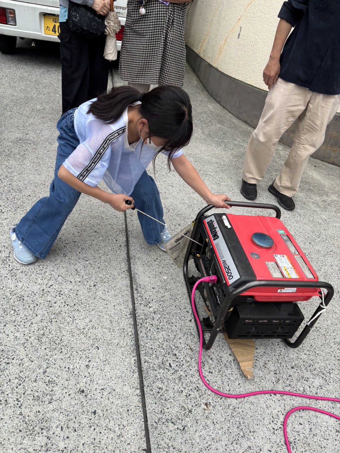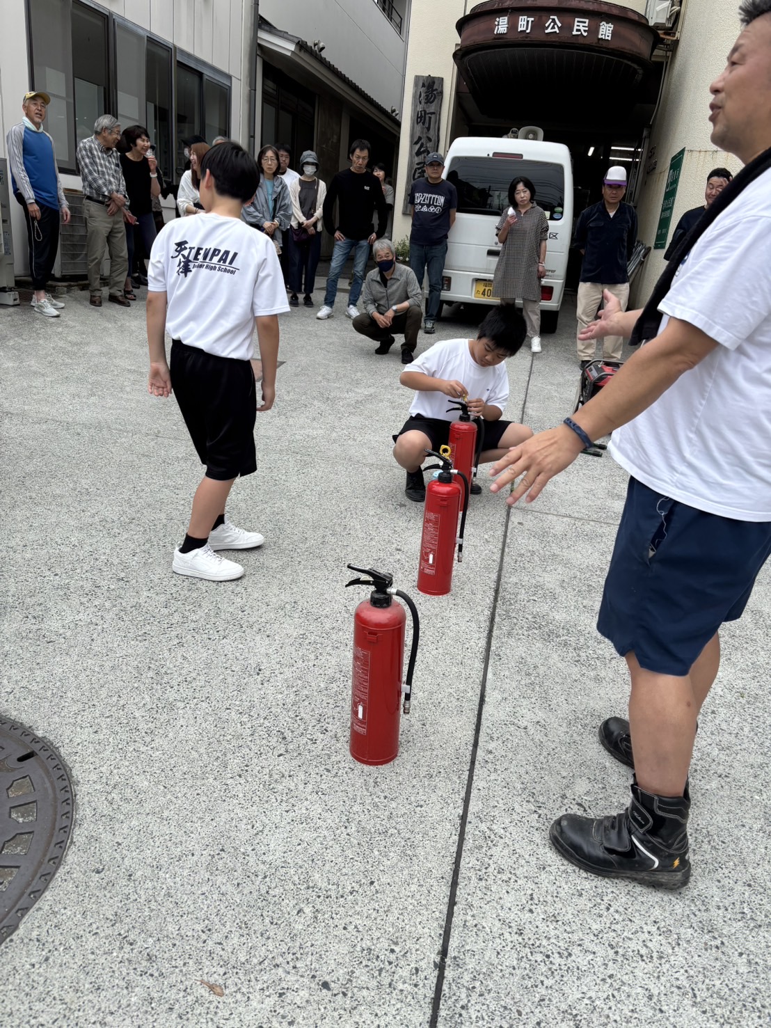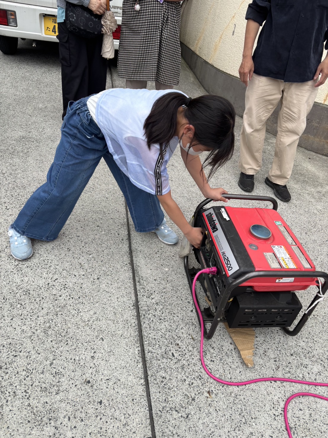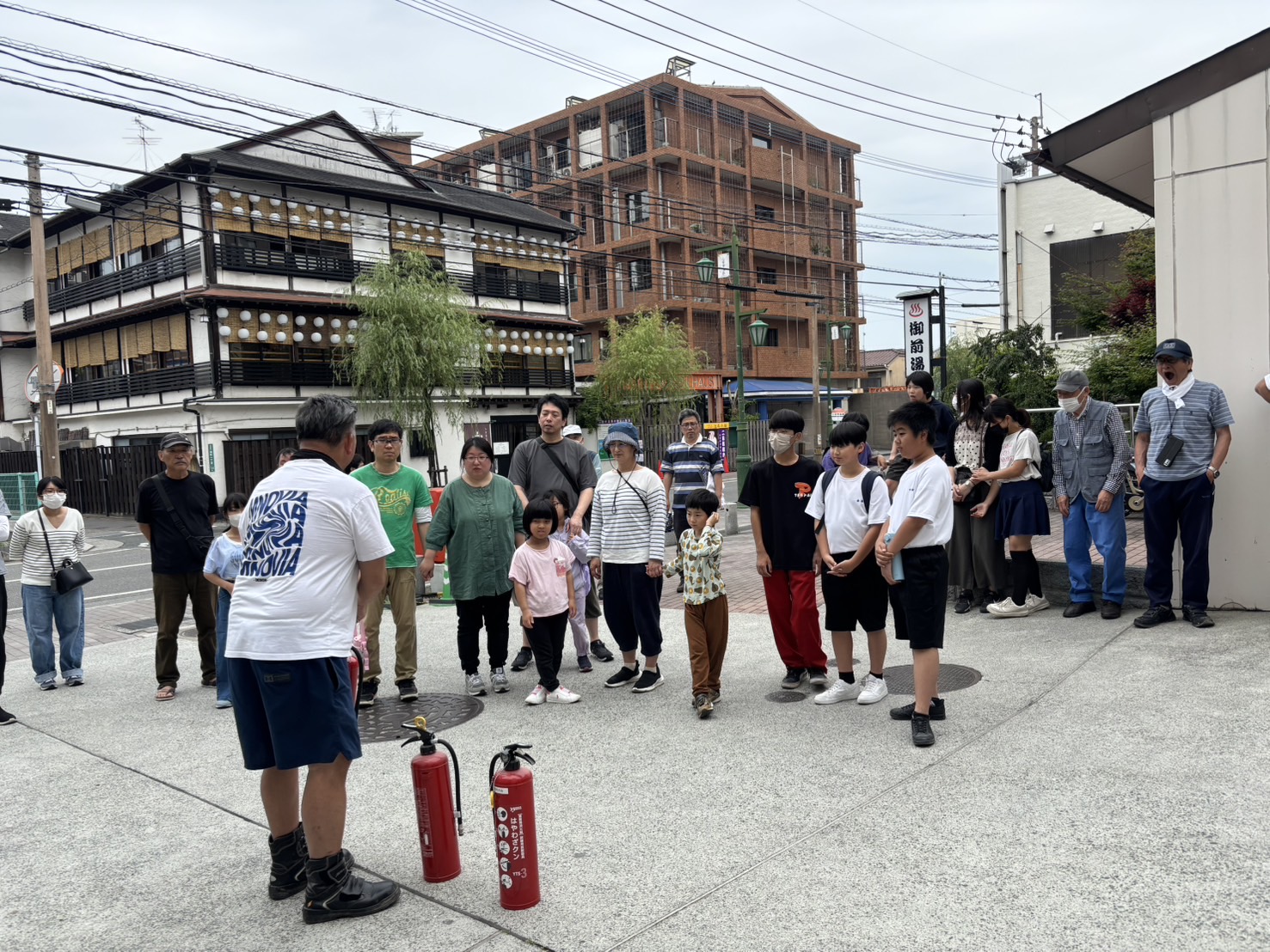 避難訓練をして、水消火器や発電機の仕方を教えて頂き、子どもたちも頑張りました。