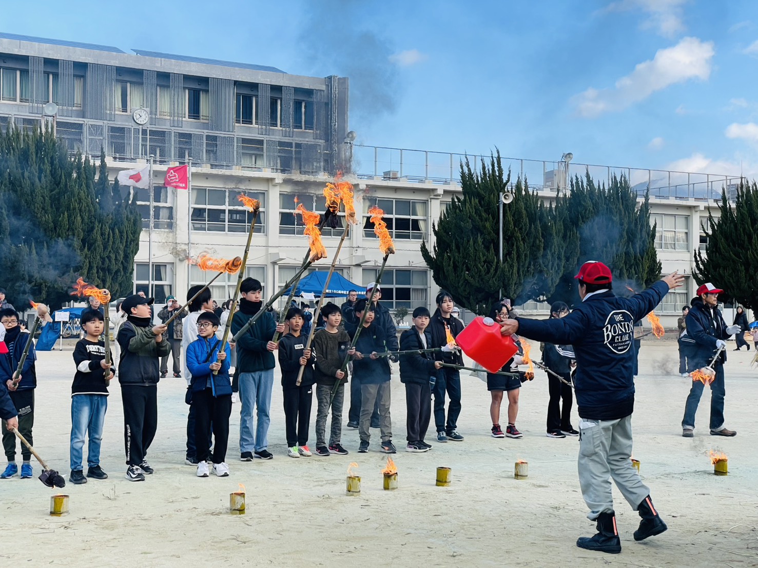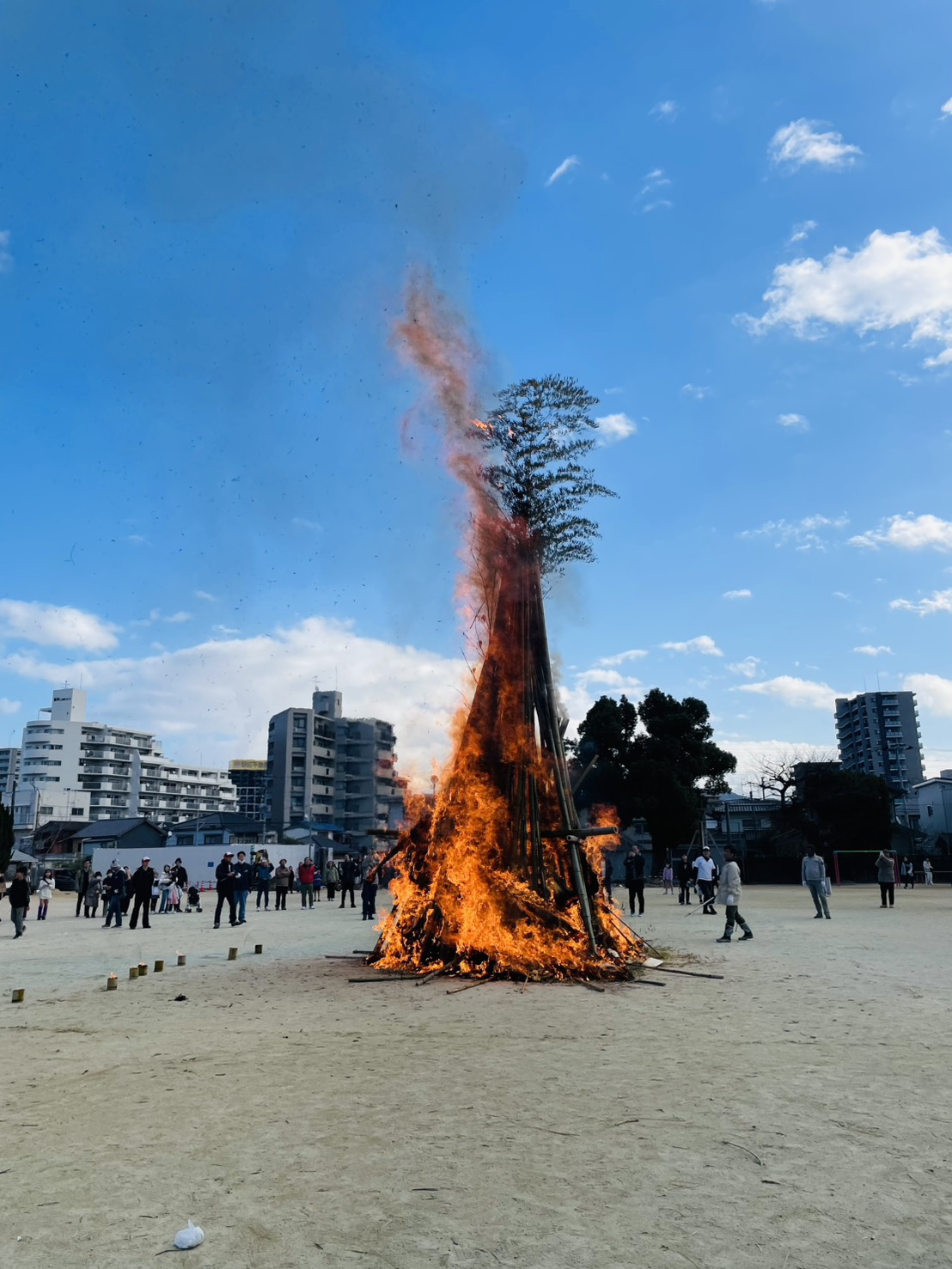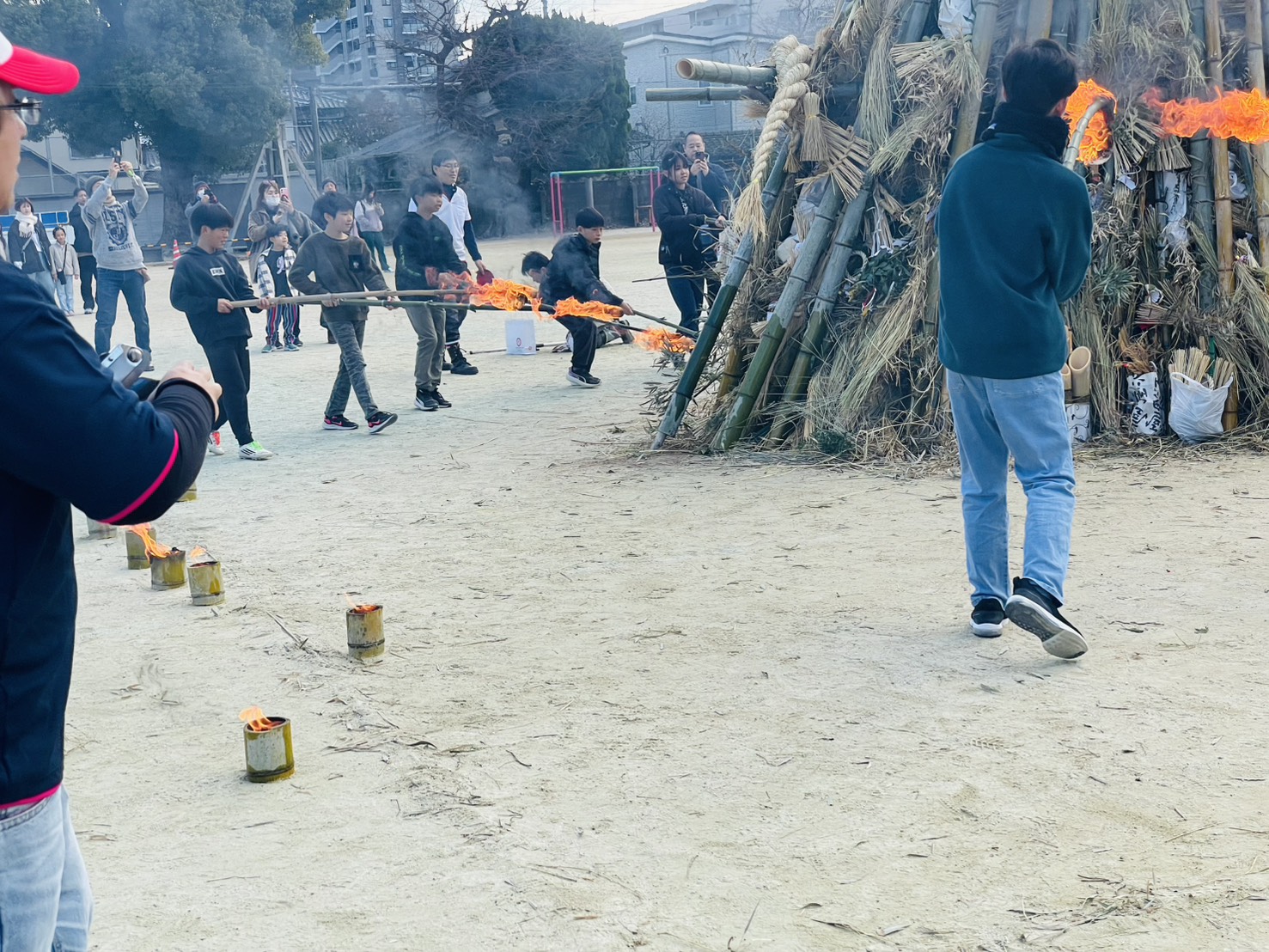 1月10日(土)二小の校庭でほうげんぎょう(どんど焼き)が行われました。真っ赤に燃え上がる炎に今年1年の無病息災を祈りました。