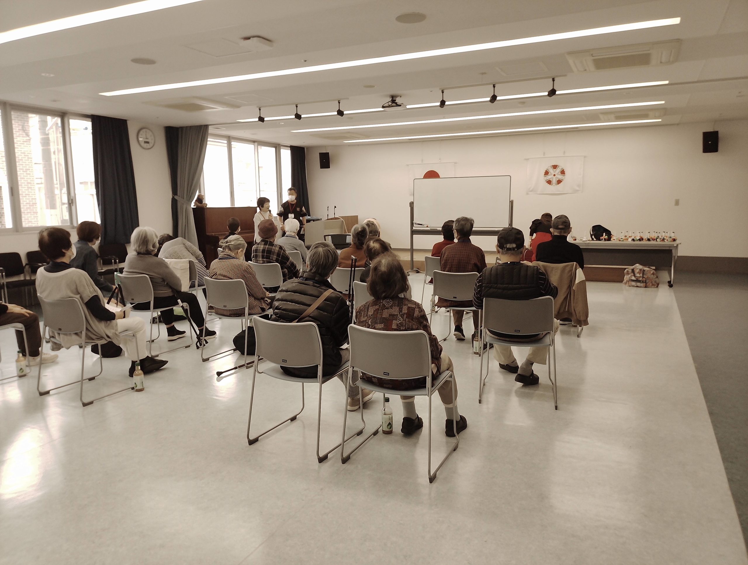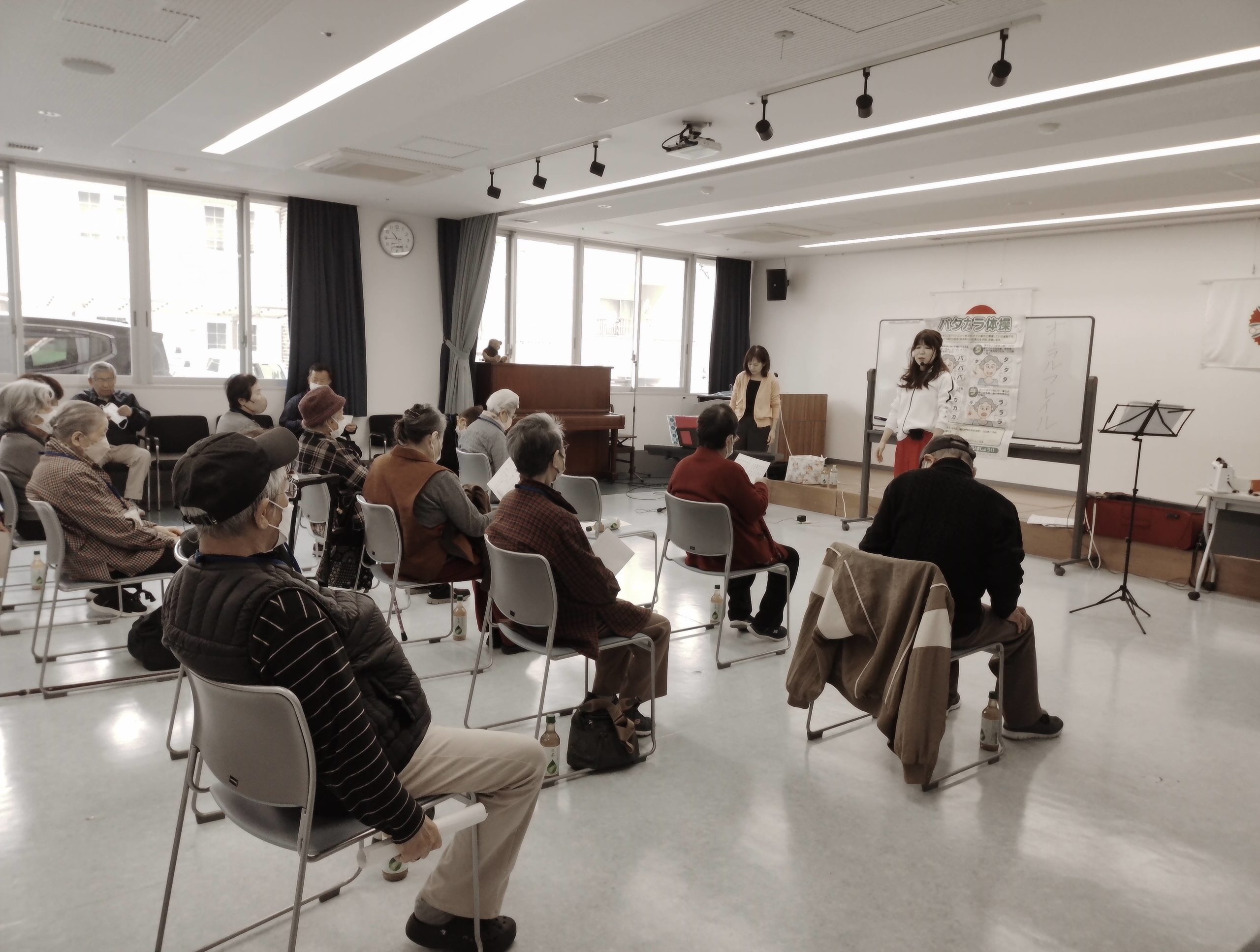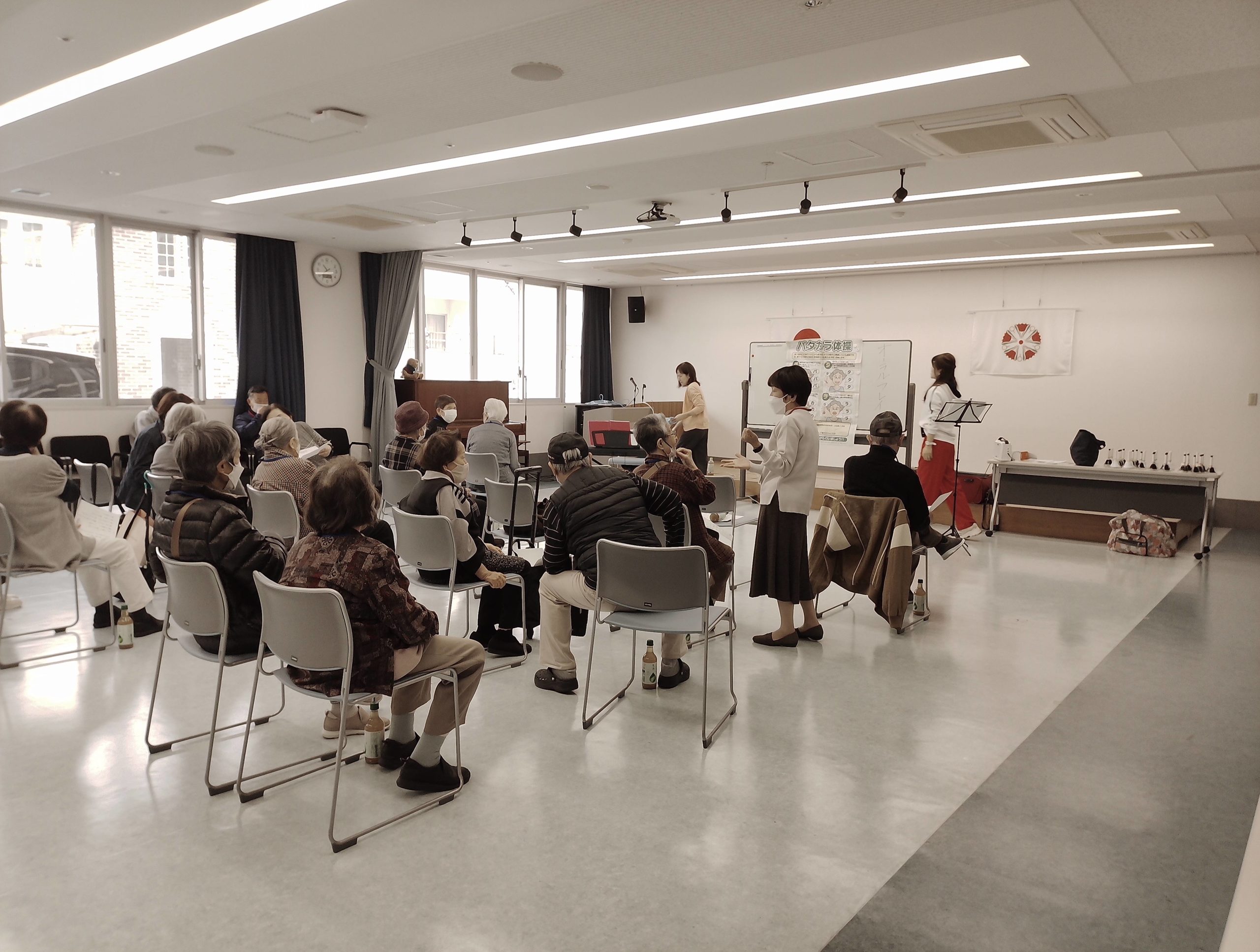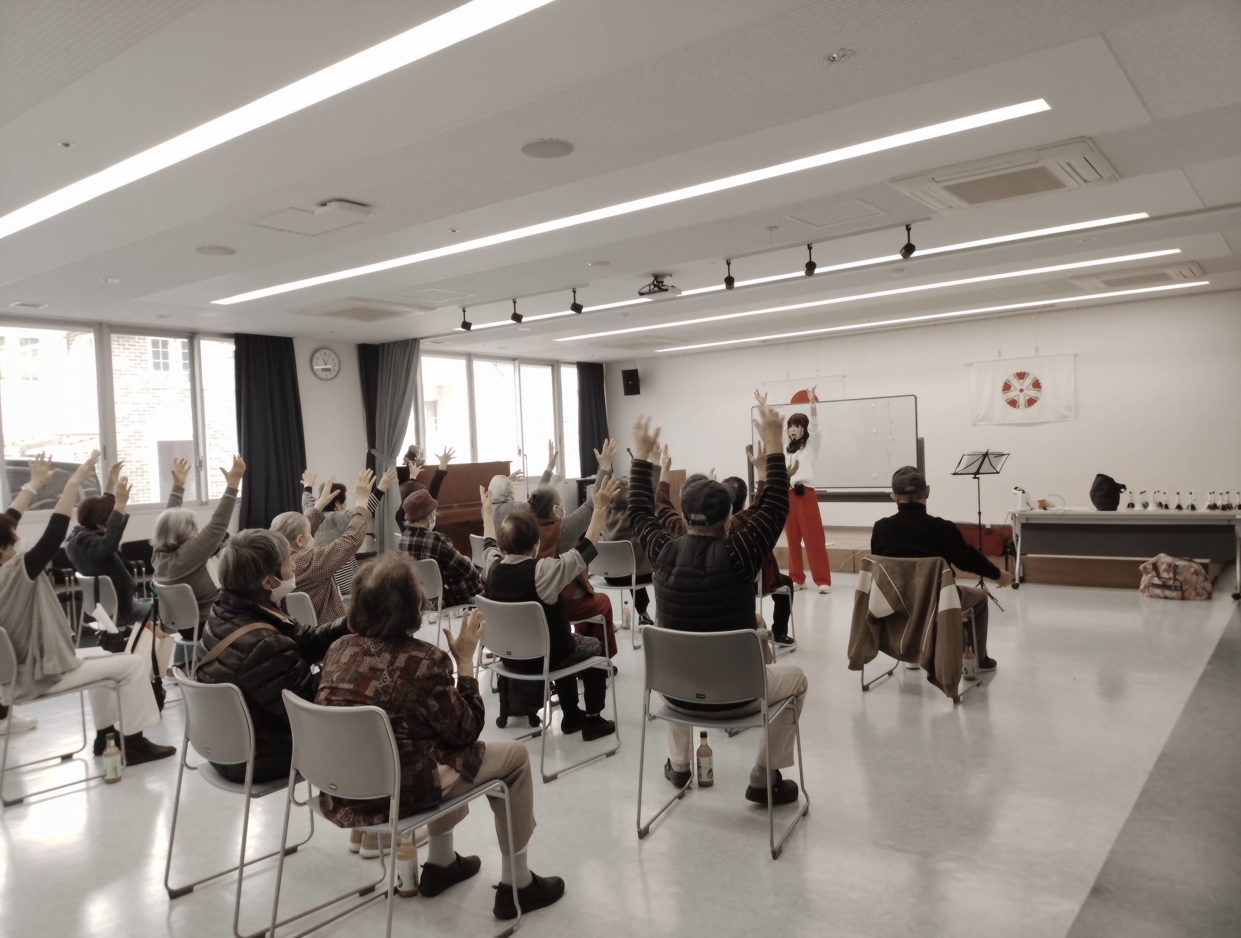 ㈱フカノ楽器さんの協力によりパタカラ体操やトーンチャイムと鈴を鳴らしての「星のフラメンコ」を演奏。みんな足踏みを交えながら多いに楽しみました。チャチャチャ♪♪
